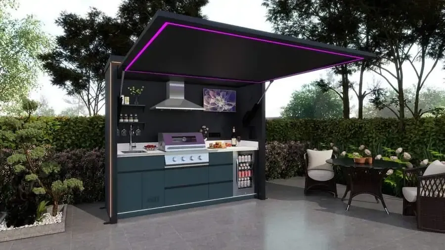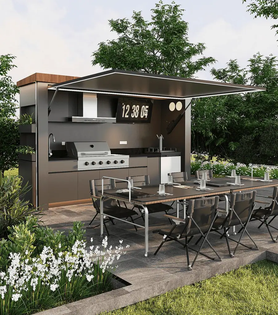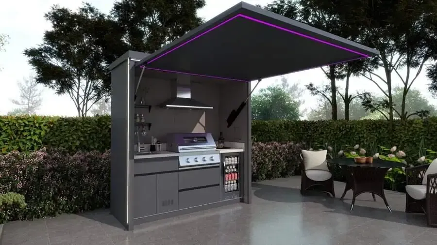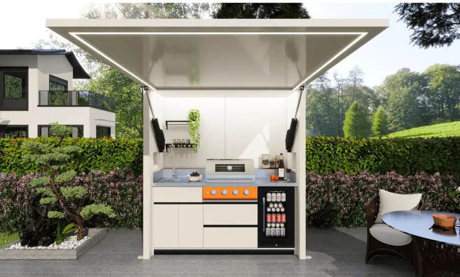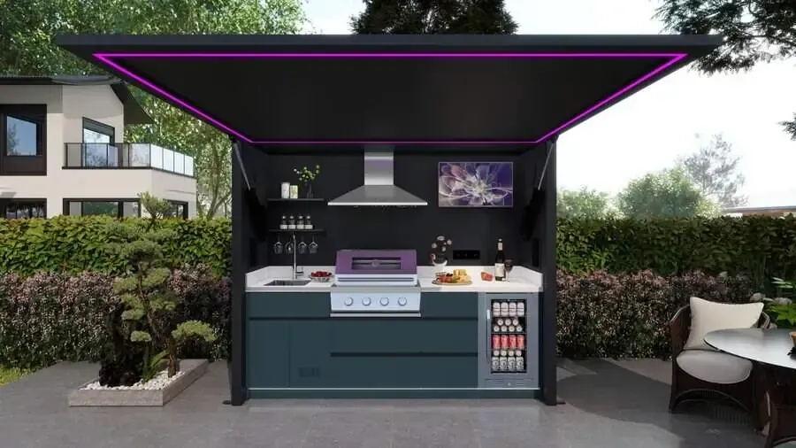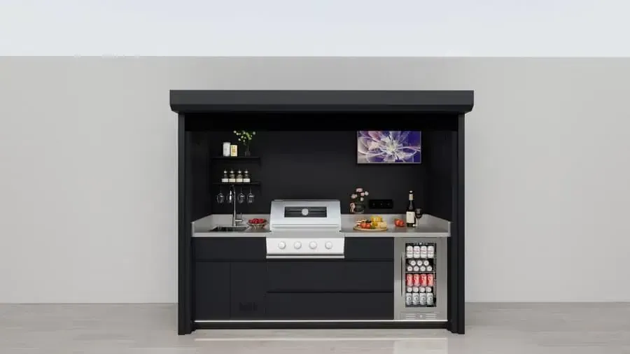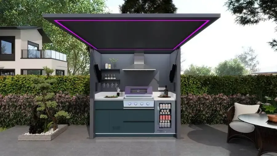 An outdoor kitchen pod is a fully integrated, weather-resistant garden kitchen unit that includes a built-in BBQ grill, worktops, storage and optional features such as sinks, lighting and entertainment space. It is designed to create a complete outdoor cooking and entertaining area without the need for a full construction project.