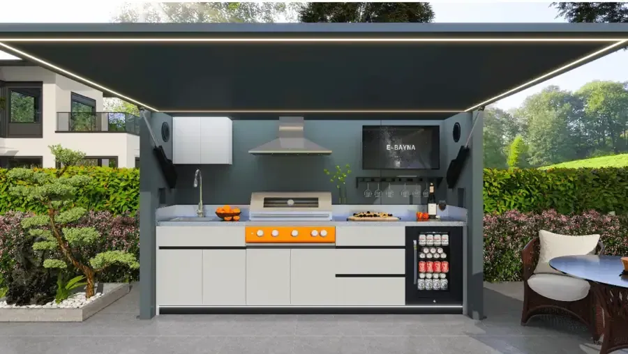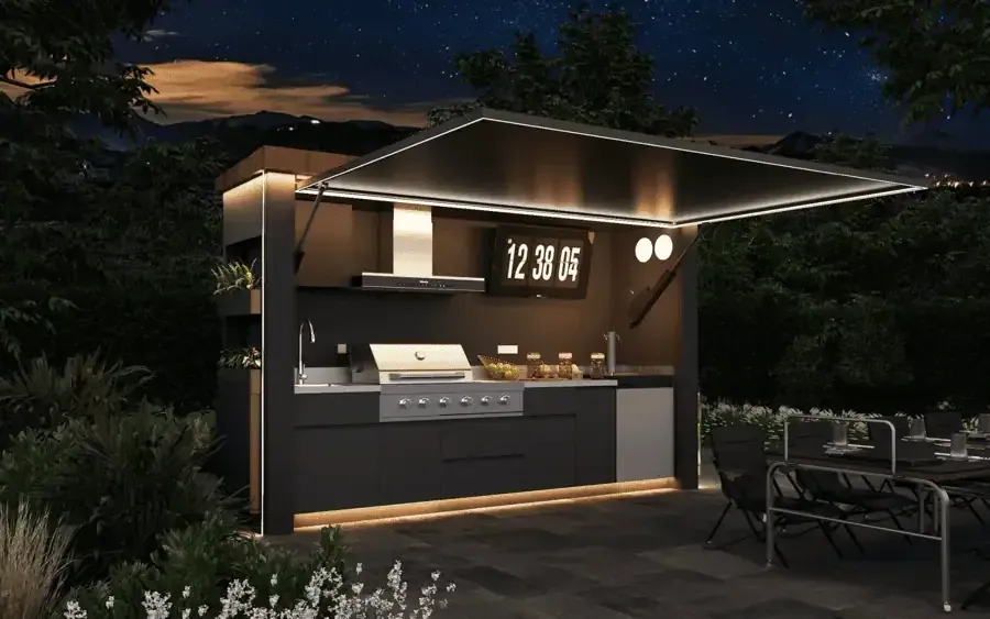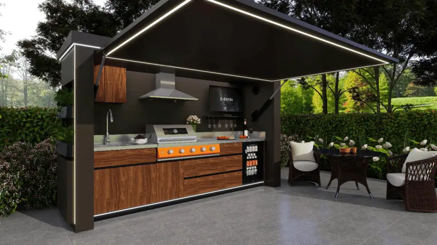 Common features include built-in gas or charcoal BBQ grills, sinks with running water, stone or stainless steel worktops, integrated lighting, electrical sockets and space for outdoor TVs or sound systems.